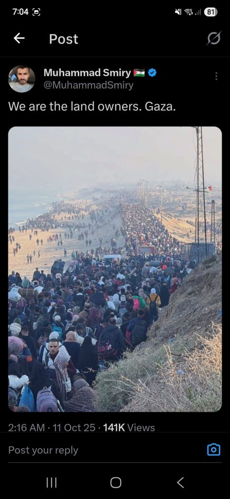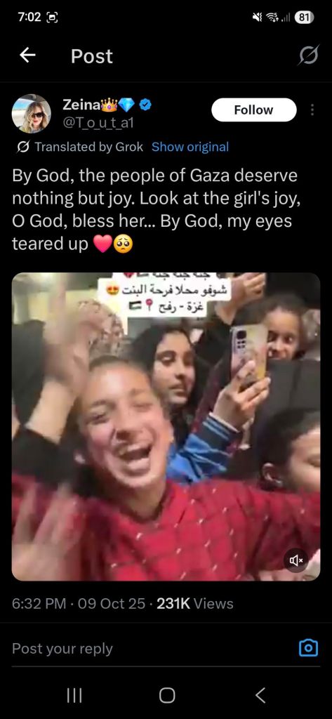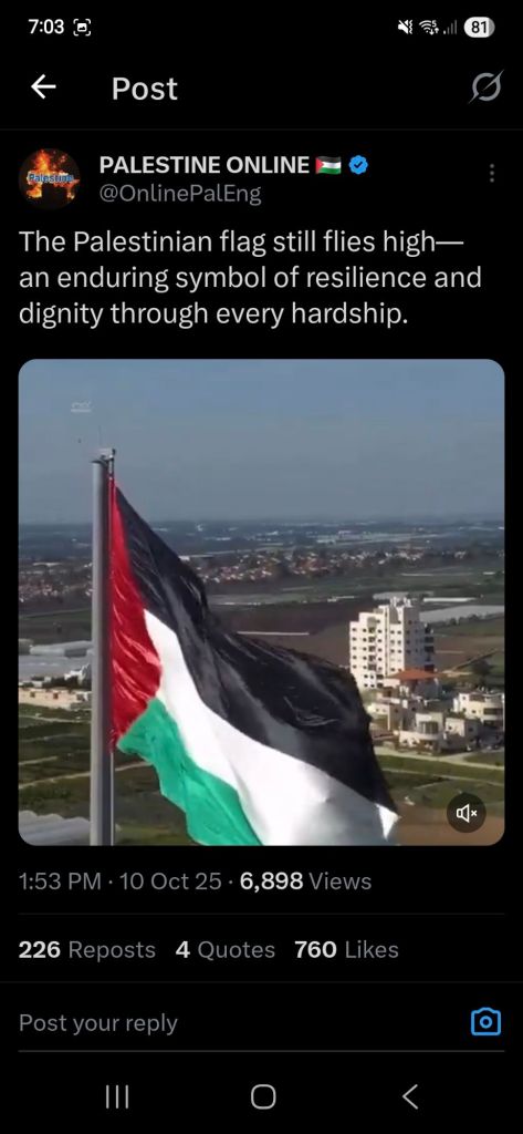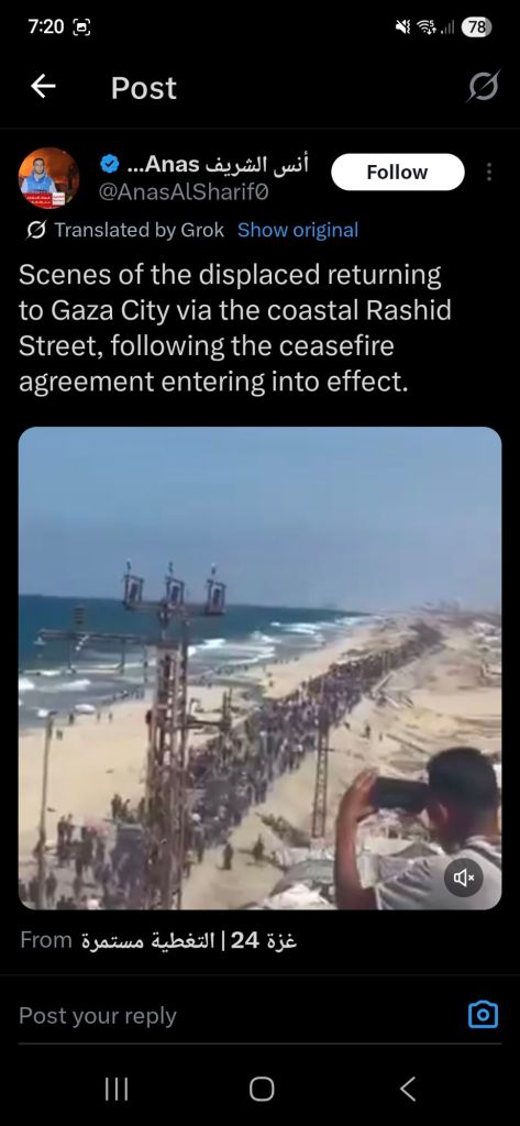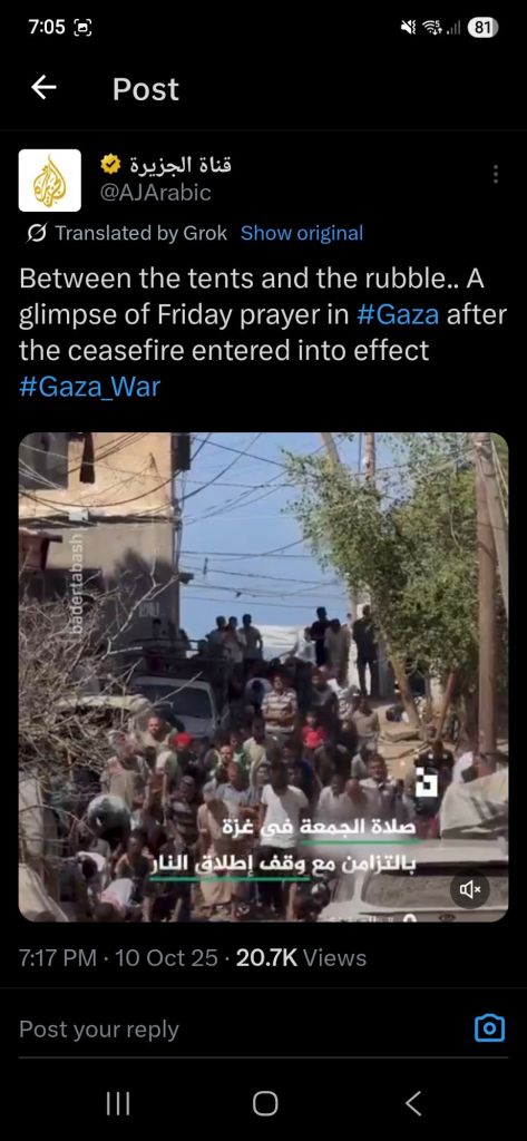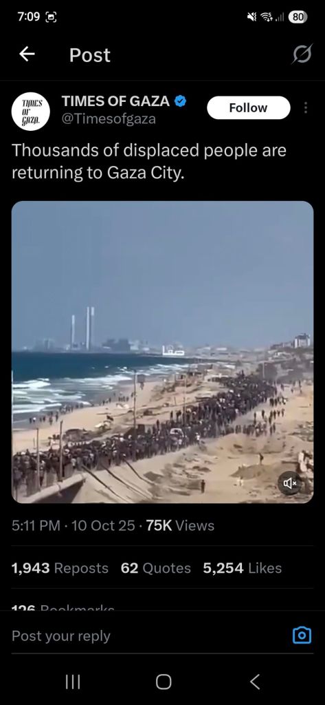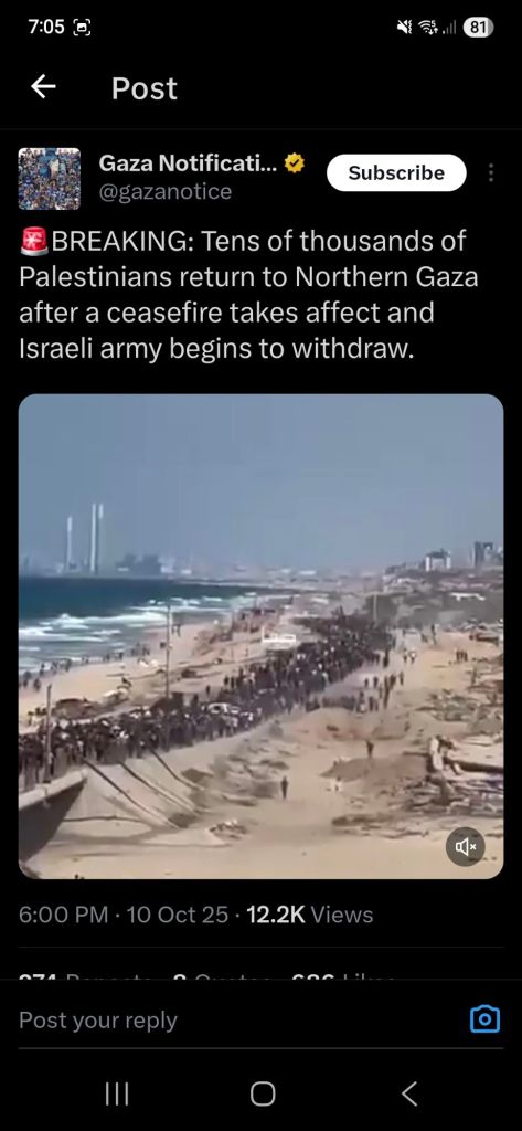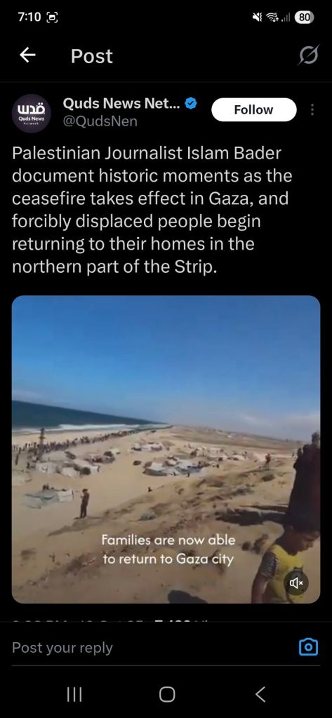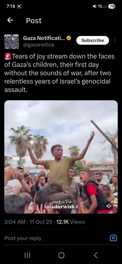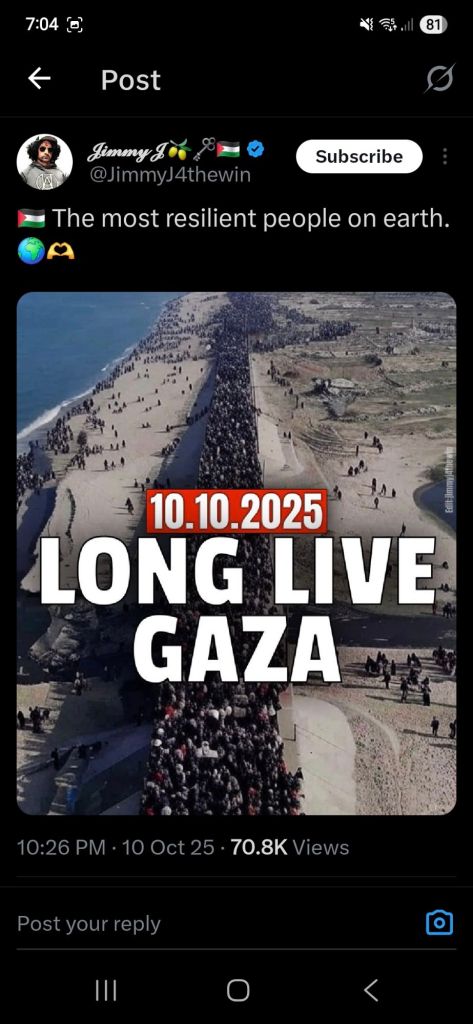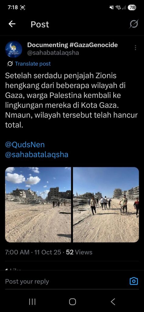Kata Hati & Jejak Langkah Return, reunite, Gaza! Posted by antonpane on 11 October 202511 October 2025 Tangkapan layar media sosial Return, Reunite, Gaza!. Medsos membuka mata dunia, membuka hati orang-orang berdiri disisi sejarah yang benar Share this: Click to print (Opens in new window) Print Click to email a link to a friend (Opens in new window) Email Click to share on Facebook (Opens in new window) Facebook Click to share on X (Opens in new window) X Click to share on WhatsApp (Opens in new window) WhatsApp Like Loading... Related