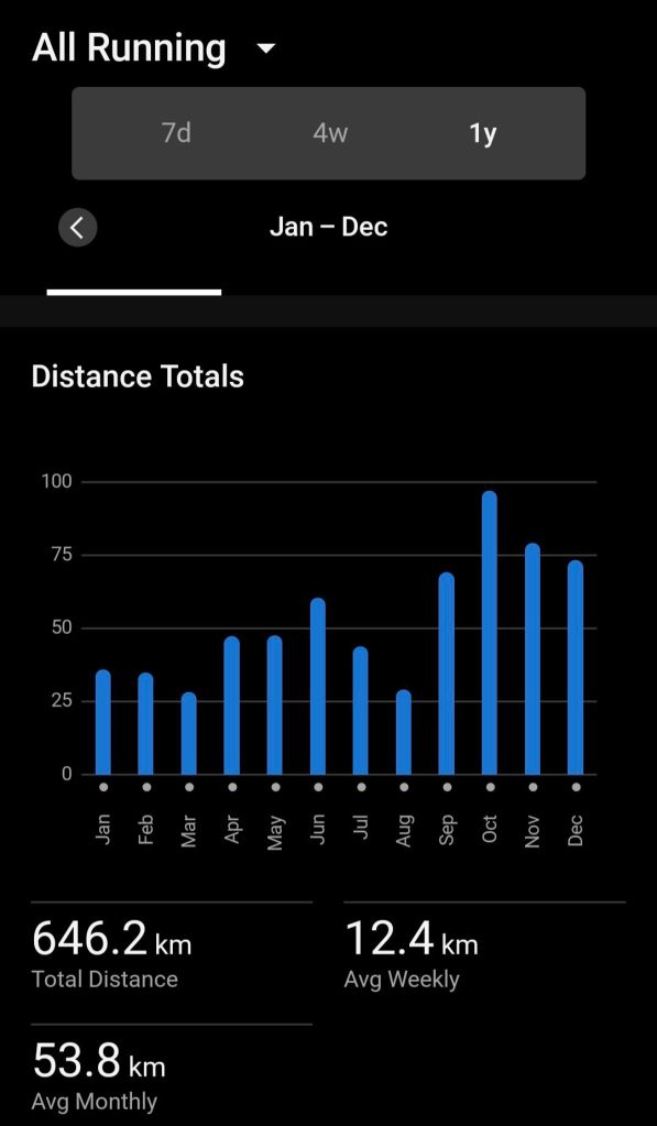2025 total 646 km, rata-rata 12.4 km per Minggu. Merubah kondisi tubuh dengan nyata, walaupun berat dan perut masih seperti sedia kala, tetapi daya tahan jauh membaik, serasa kembali ke masa-masa bertahun-tahun lalu.